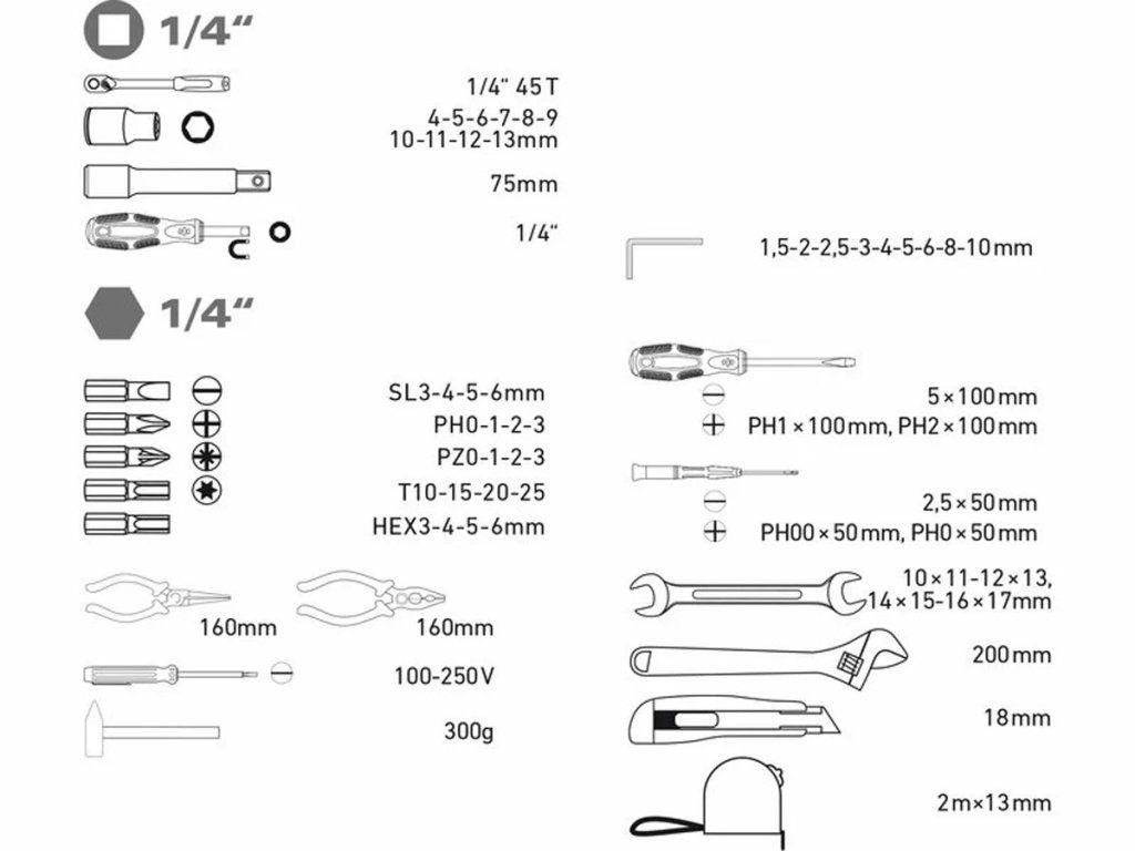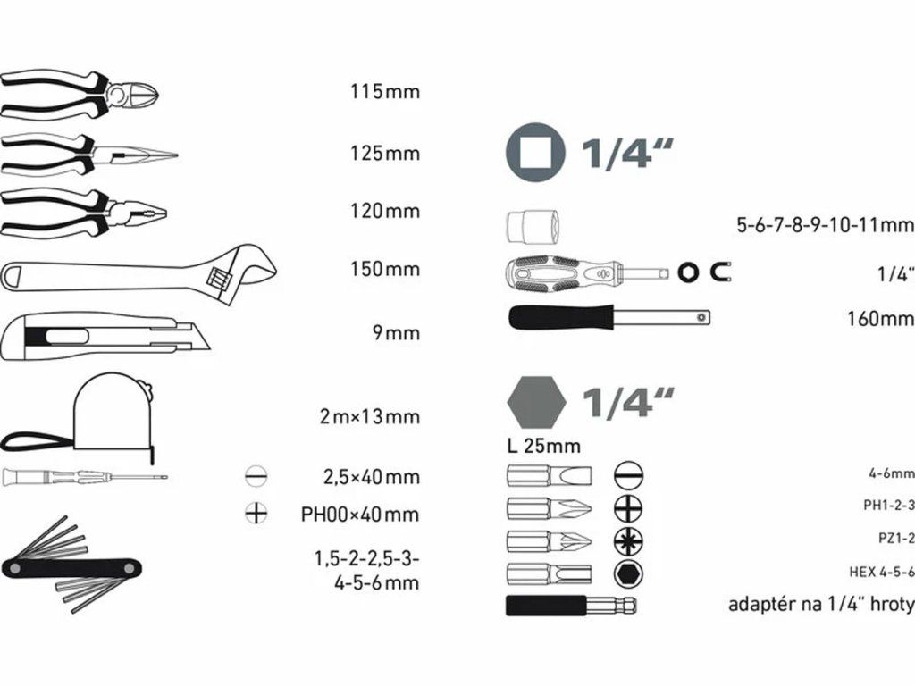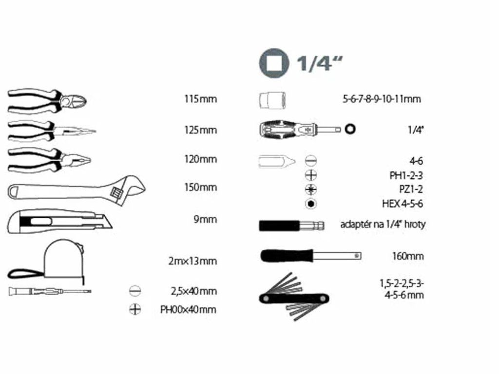 Sada obsahuje: Šroubovák se čtyřhranem 1/4" Nástrčné klíče 1/4" 5-6-7-8-9-10-11 Prodlužovací nádstavec 1/4" Šroubovák magnetický na bity Bity ploché 4-6 mm Bity PH1-2-3 Bity PZ1-2 Bity HEX4-5-6 Hodinářský šroubovák plochý 2,5x40 mm Hodinářský šroubovák PH00x40 mm Imbusové klíče 1,5-2-2,5-3-4-5-6 mm nastavitelný klíč 150 mm Kleště kombinované 120 mm Kleště štípací 115 mm Kleště polokulaté přímé 125 mm Měřící pásmo 2mx13mm Nůž olamovací 9 mmDoplňkové parametry