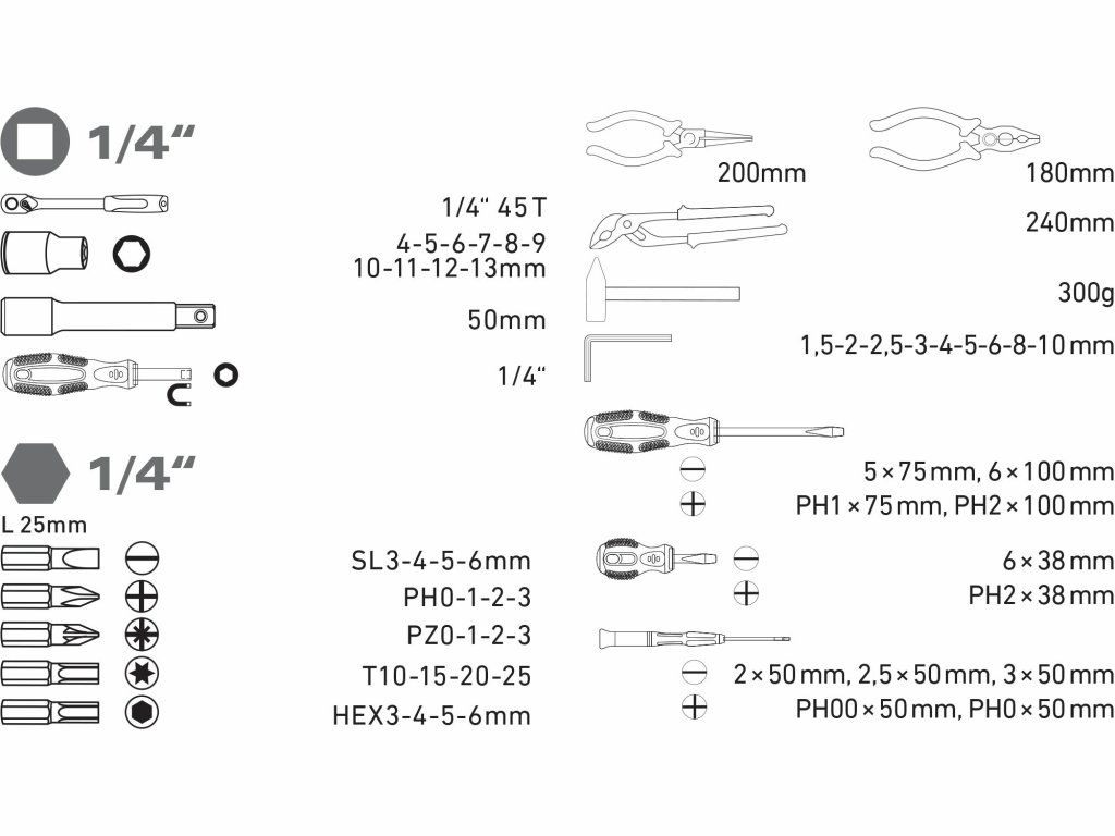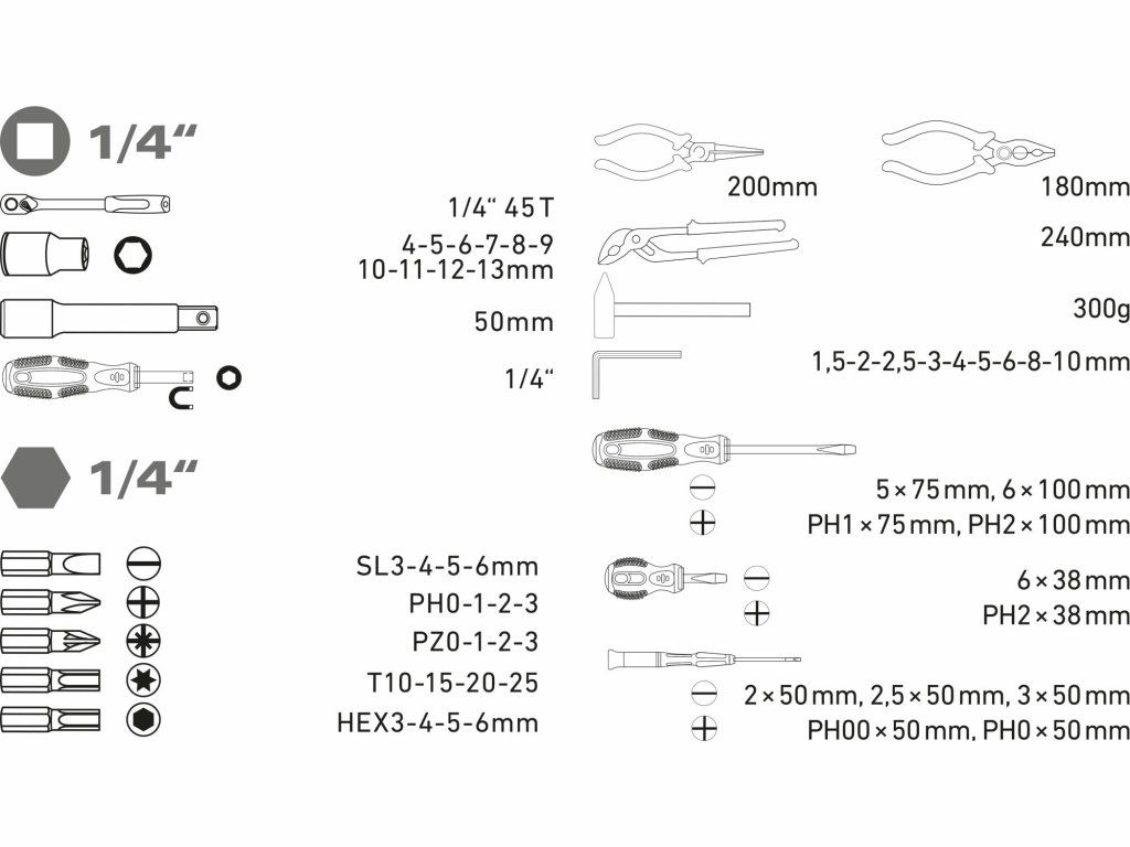 Sada obsahuje: Ráčna 1/4" - 45 zubů Nástrčné klíče 1/4" 4--5-6-7-8-9-10-11-12-13 mm Prodlužovací nástavec 1/4" 50 mm Šroubovák nabitý Bity 1/4" 25 mm ploché 3-4-5-6 mm Bity 1/4" 25 mm PH0-0-1-2-3 Bity 1/4" 25 mm PZ0-1-2-3 Bity 1/4" 25 mm HEX 3-4-5-6 mm Bity 1/4" 25 mm TORX T10-15-20-25 Imbusový klíč 1,5-2-2,5-3-4-5-6-8-10 mm Šroubovák rovný 5x75, 6x100 mm Šroubovák PH1x75, PH2x100 mm Šroubovák rovný 2x50, 2,5x50, 3x50 mm Šroubovák PH00x50, 0x50 mm Kleště kombinované 180 mm kleště oblé 200 mm Kleště štípací 160 mm Kleště oblé 160 mm Siko kleště 240 mm Kladivo 300 g Plastový kufrDoplňkové parametry