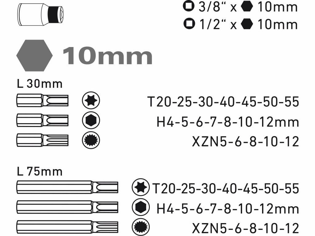 Sada obsahuje: Bity 10 mm (L 30 mm): HEX 4-5-6-7-8-10-12 TORX 20-25-30-40-45-50-55 XZN (M) 5-6-8-10-12 Bity 10 mm (L 75 mm): HEX 4-5-6-7-8-10-12 TORX 20-25-30-40-45-50-55 XZN (M) 5-6-8-10-12 Adaptéry: 3/8"x10 mm 1/2"x10 mm Plastový kufříkDoplňkové parametry