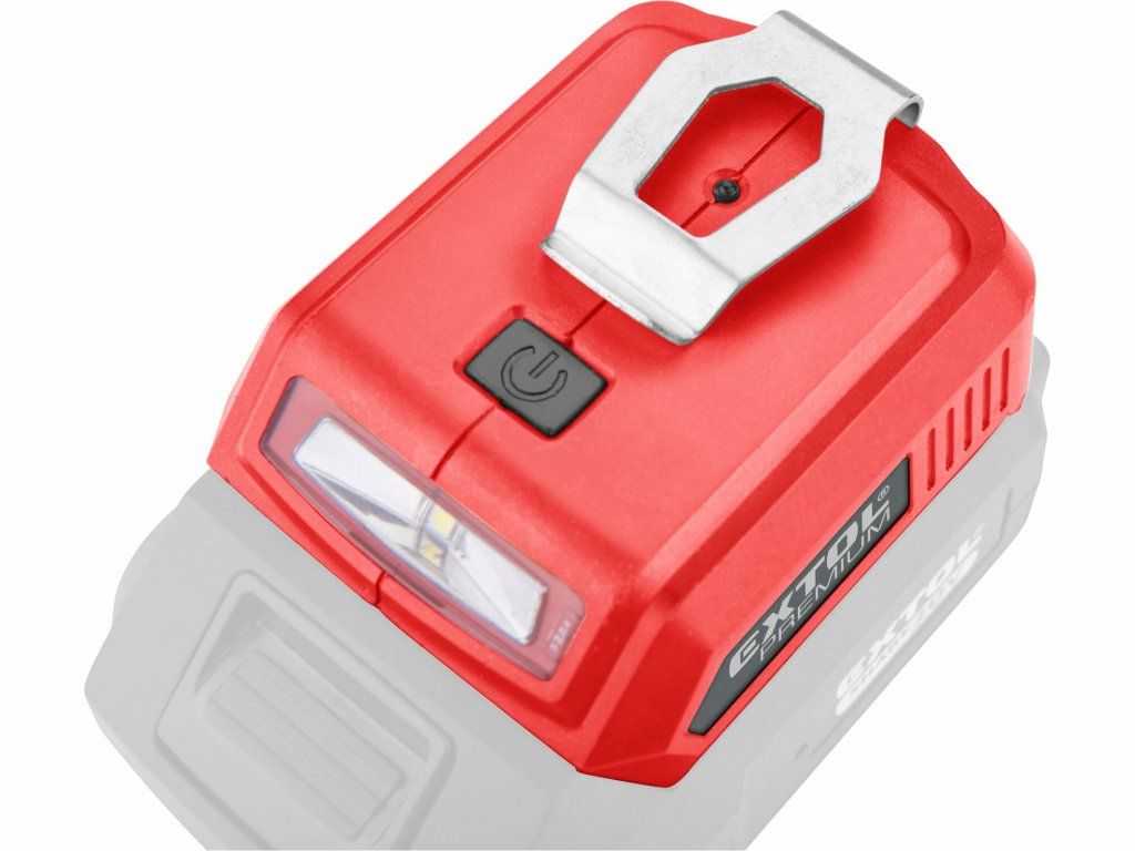 Nabíjecí USB adaptér k akumulátorům EXTOL Share20V. Po připojení k akumulátoru slouží jako powerbanka pro nabíjení různých mobilních zařízení. Akumulátor není součástí balení. po připojení k akumulátoru slouží jako powerbanka se dvěma USB-A výstupy spona na zavěšení na opasek LED svítilnaDoplňkové parametry